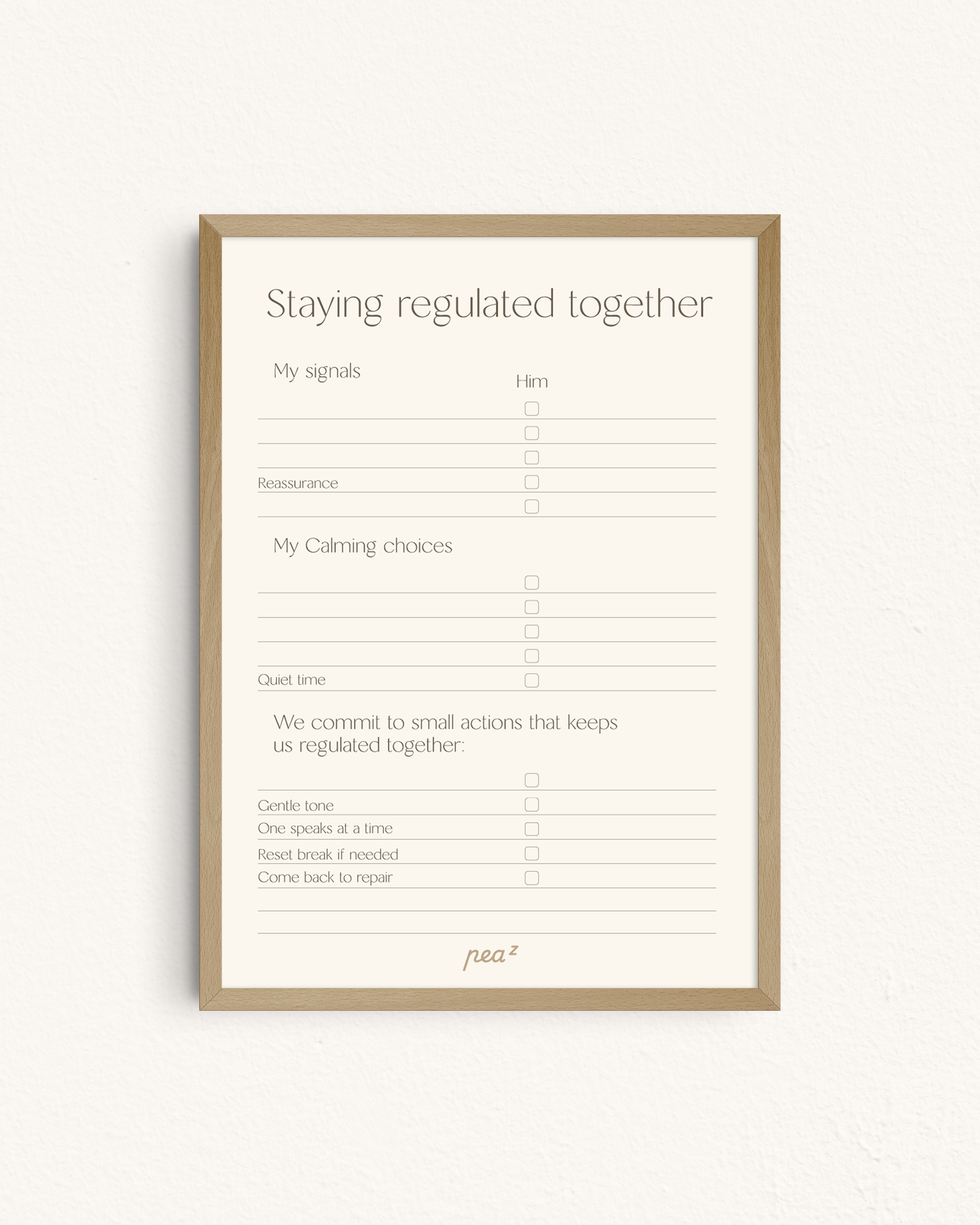 Created for partners navigating stress, parenting, work pressure, or recurring arguments, this board provides a clear framework for expressing signals, calming choices, and shared commitments.